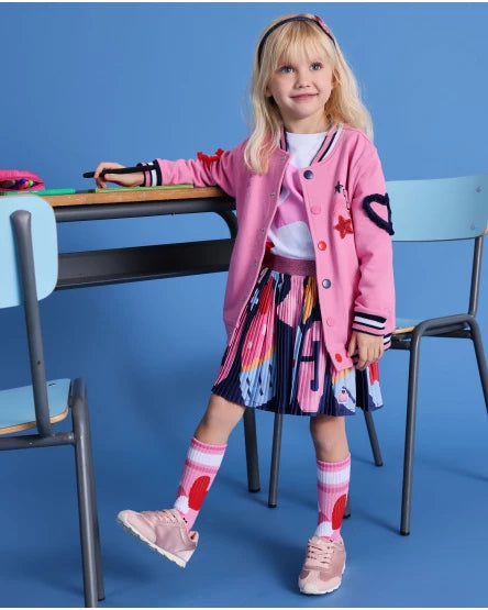 Pleated skirt for girls with a vibrant multicolor print featuring stars and cupcakes in pink, blue, and red. Shiny pink elastic waistband.