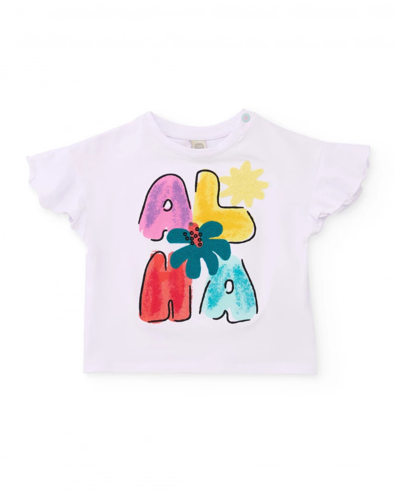 Girls’ T-shirt made from a soft, comfortable fabric, ideal for everyday wear. It features short sleeves with a small frill, adding a delicate and feminine touch. The front showcases a colourful “ALOHA” print, complemented by floral details that create a cheerful, summery look. The round neckline includes a side snap for easier dressing. A comfortable, fresh and vibrant piece.