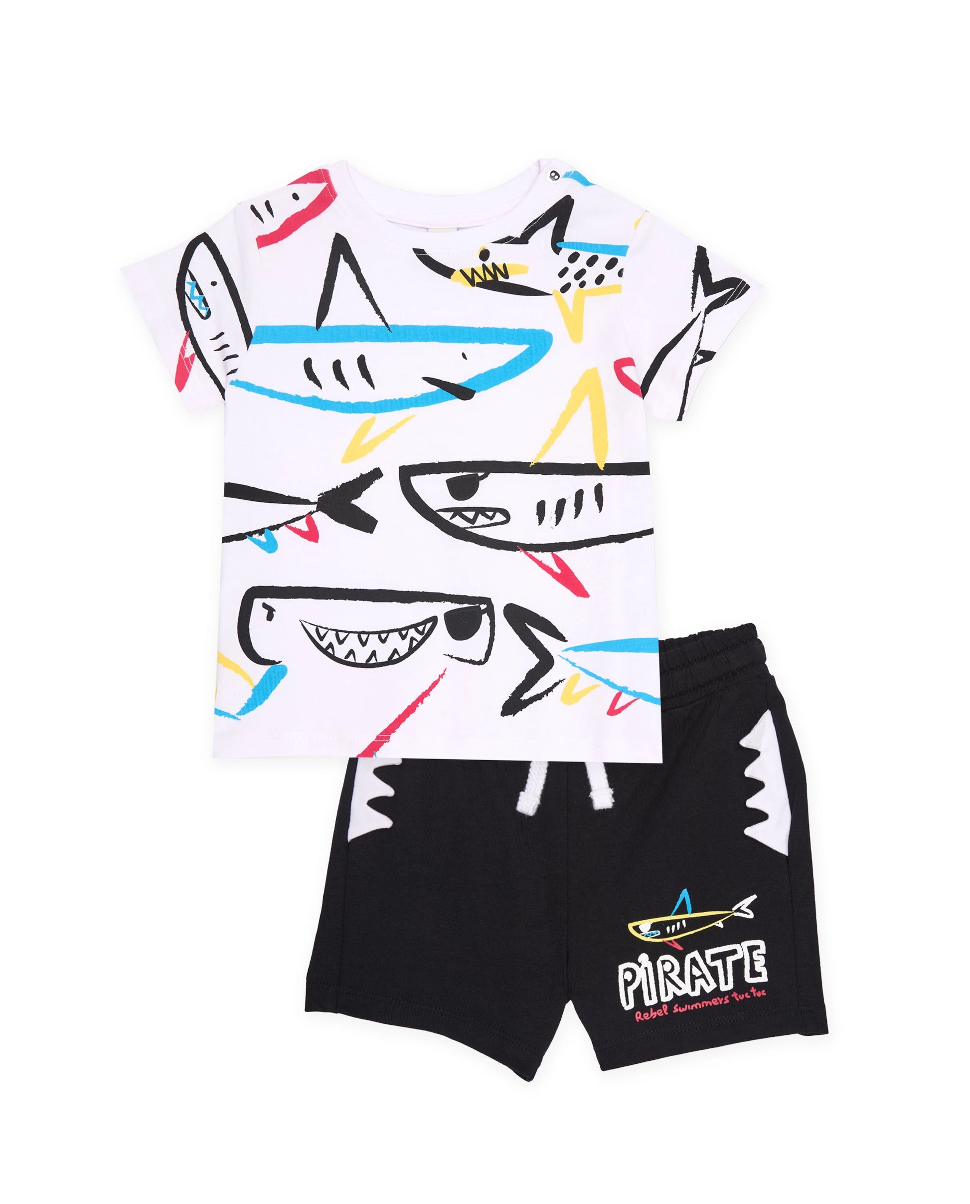 This boys' outfit, consisting of a white t-shirt and black shorts, is made from soft, comfortable fabrics perfect for everyday wear. The t-shirt, primarily white, features an all-over shark print with vibrant colors, giving it a dynamic, summery look. It includes snap closures at the shoulder for easy dressing. The black shorts have an elastic waistband with an adjustable drawstring for a comfortable fit. A printed shark detail and the word "Pirate" are featured on the leg, complementing the t-shirt design and adding a cohesive look. This practical, cool, and stylish outfit is perfect for accompanying your child on any activity.
