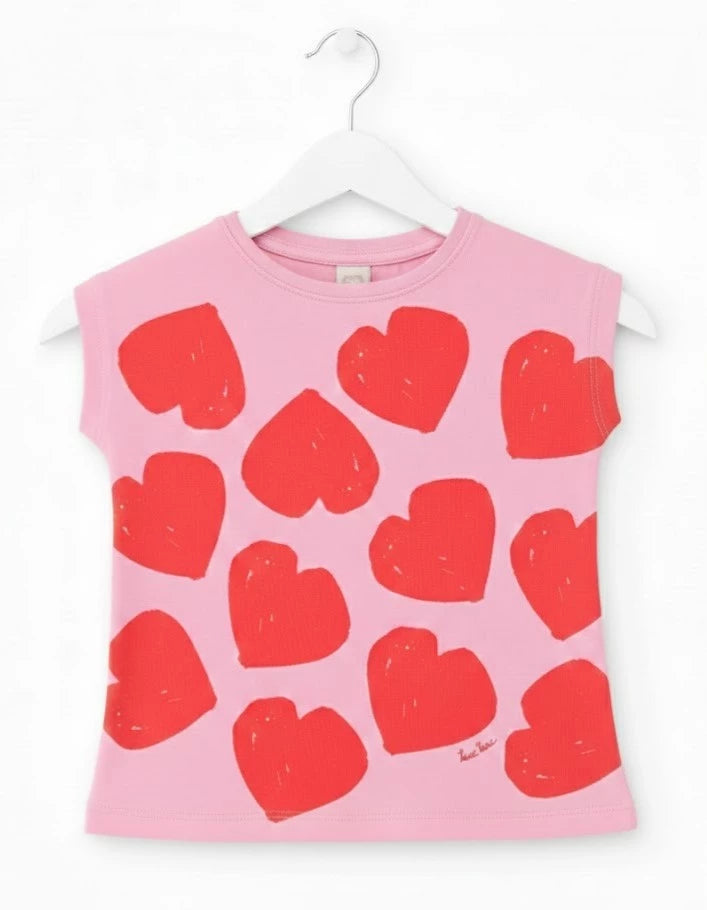 This pink t-shirt for girls is made from a soft and comfortable fabric, perfect for everyday wear. It features a striking red heart print across the front, creating a cheerful and eye-catching design. The round neck and short sleeves make it easy to style and ideal for warmer days. This casual and charming style will add a playful touch to any outfit.