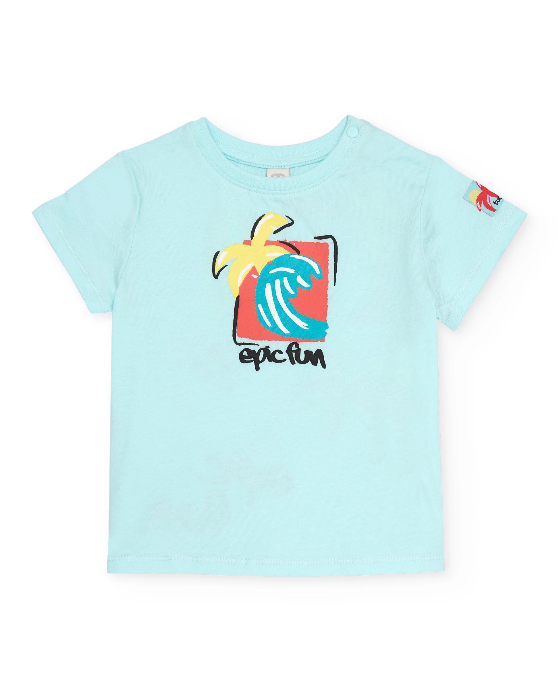 T-shirt for boys made from soft, lightweight cotton jersey, ideal for warm days. It features a summer-inspired front print with a moving wave, a palm tree and a vibrant-coloured background, giving the design a fresh and relaxed look. Two snap buttons on the shoulder make dressing easier and ensure a comfortable fit. A small graphic detail on one sleeve adds an extra distinctive touch. A simple, bright T-shirt, perfect for completing casual outfits throughout the summer season.